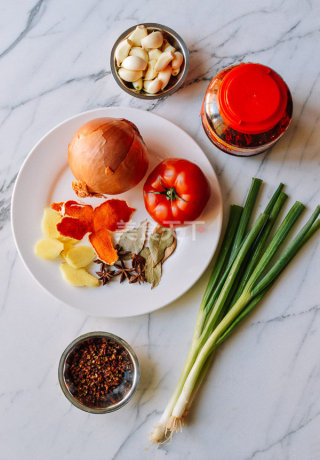 輔料:紹興酒 1湯匙;蔥 適量;姜 適量;蒜 3瓣;八角 2個(gè);香葉 4片;花椒 少量;洋蔥 一個(gè);豆瓣醬 1湯匙;醬油 4湯匙;糖 1湯匙;番茄 半個(gè);橄欖油 2湯匙