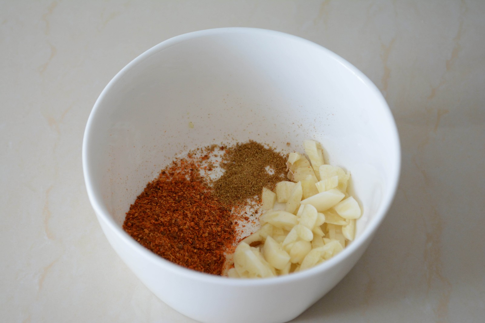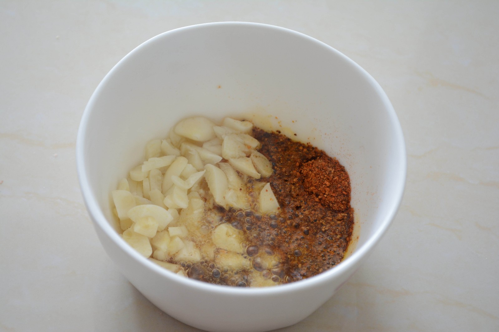 澆在辣椒粉,十三香,蒜粒上后馬上攪拌均勻備用。