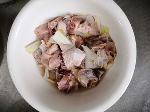 (2)鍋中加入炒好的料油加入姜蒜片炒香把雜質打出,將雞肉放入燒調味(鹽,雞精,味精,糖)入味后加