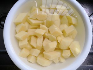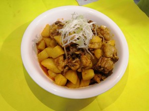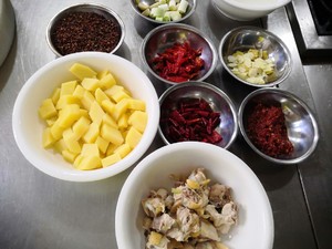 工藝流程:土豆削皮切塊_油炸_雞改刀氽水過油炸_炒料加湯_下雞塊入味_下土豆_調味_收汁_裝盤。