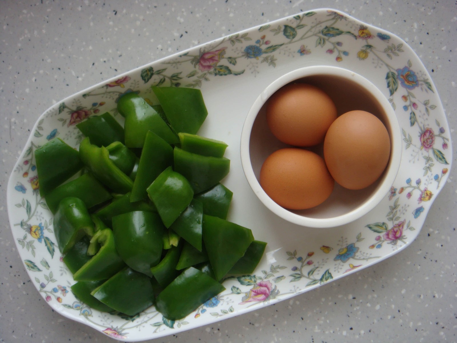 1.準(zhǔn)備食材:雞蛋:3個,青椒:2個,皇牌沙茶王:2勺、甜面醬:2勺。