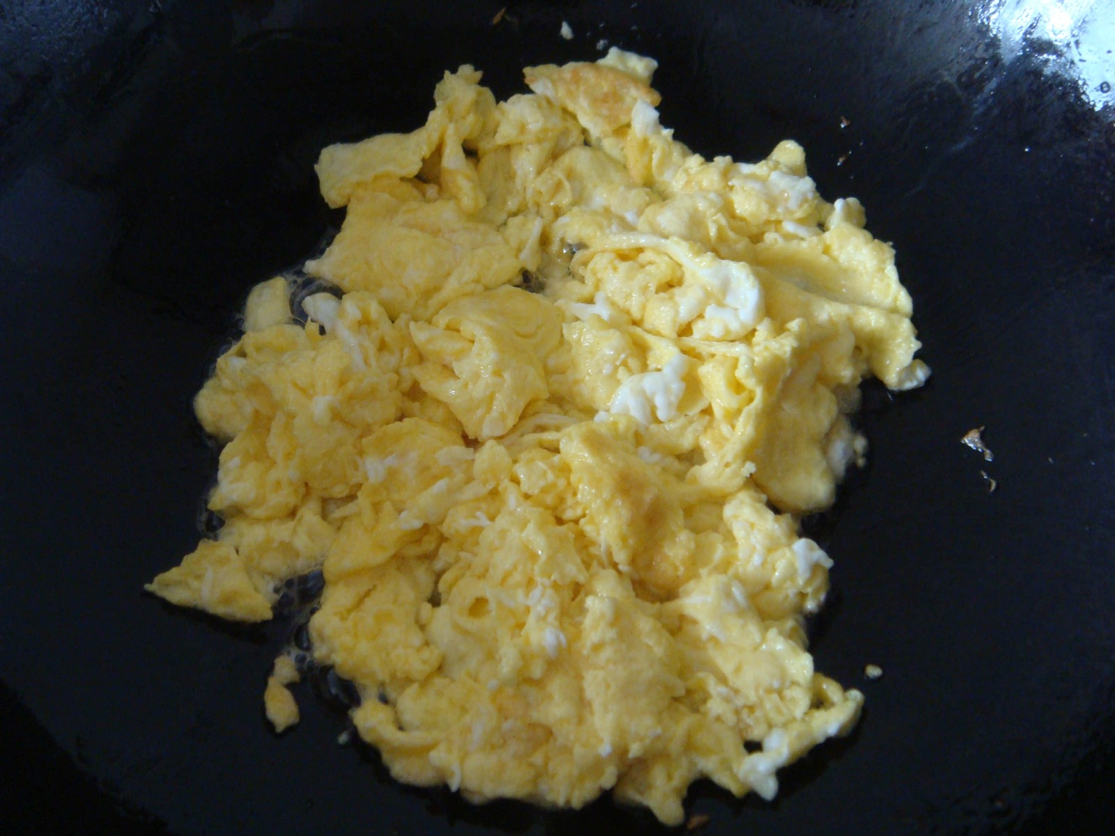 2.鍋中倒油,油熱后倒入打好的雞蛋,炒成小大適中的塊兒,盛出備用。