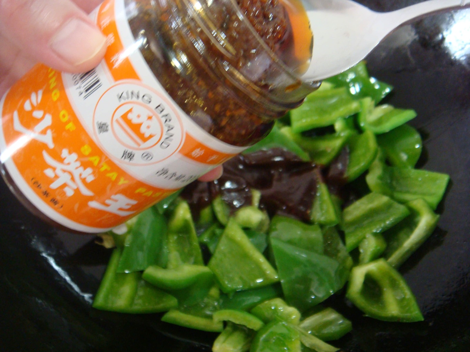 4.放入皇牌沙茶王:2勺、甜面醬:2勺,因?yàn)檫@兩種醬料都是有咸度的了,所以我沒有再加鹽,您也可以根據(jù)自己的口味決定是否添加少量的鹽。