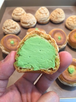 方中抹茶餡料只能填8個(gè)泡芙,喜歡的可以翻倍增加。沒填餡的泡芙密封冷藏保存,在三天內(nèi)吃完口感會(huì)好些。泡芙的外皮有著酥脆的口感,所以最好在吃之前才填上餡料。因?yàn)槿绻^早填入餡料,外皮會(huì)吸收餡料里的水分而變得濕軟。