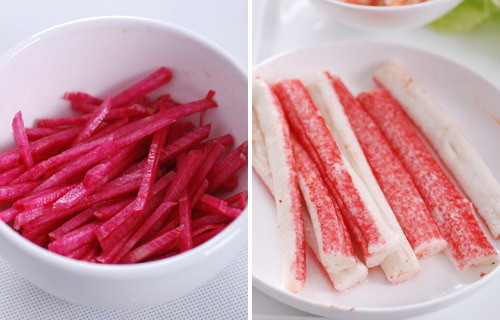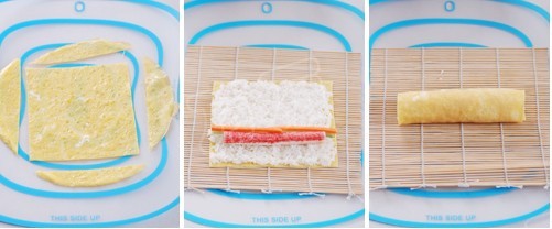 2.用鹽、糖、白醋按1∶5∶10熬好壽司醋,拌入蒸好的米飯中(粳米:糯米=4:1),涼至手溫即可。蛋皮切成方形,鋪一層米飯,放上半跟蟹肉棒,胡蘿卜黃瓜,卷起即可