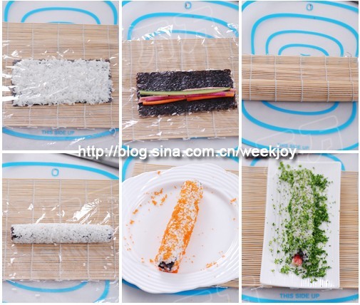3.外卷:先鋪半張海苔,鋪一層米飯,米飯整個鋪滿海苔,然后鋪一層保鮮膜,然后手提保鮮膜和海苔倒過來,讓保鮮膜在下面,海苔在上面,卷起即可。要一邊卷,一邊把壽司簾和保鮮膜往前拉,不要一起卷進去。把蟹籽或者切好的西蘭花碎鋪在大盤子里,放上卷好的外卷滾一圈即可