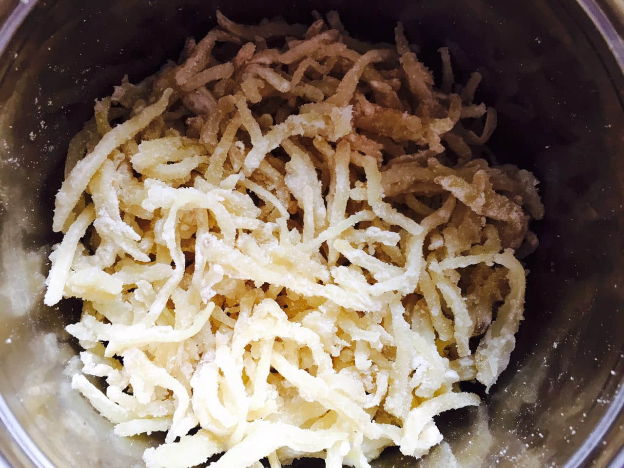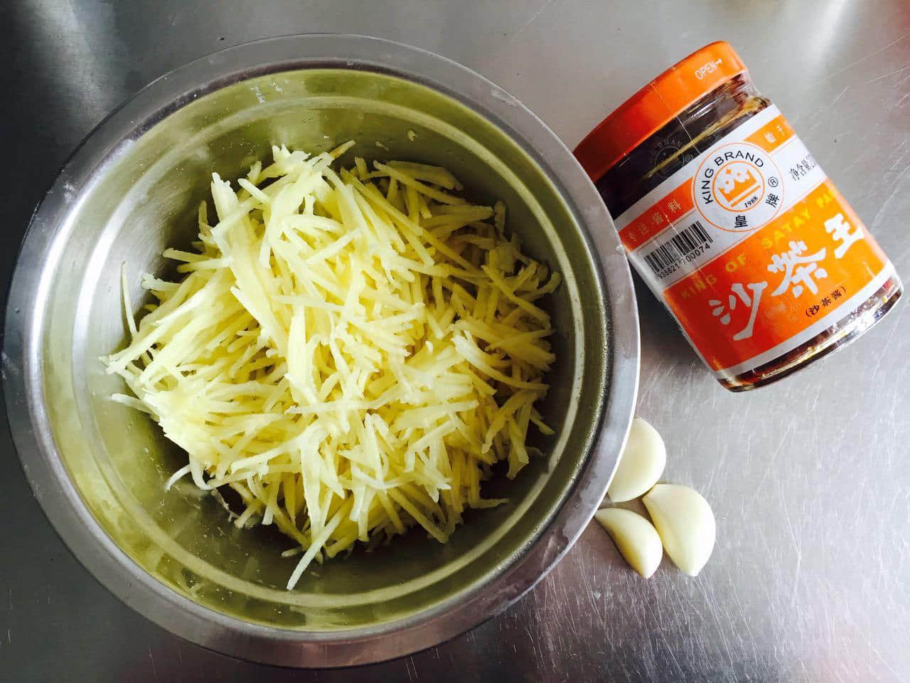 材料:皇牌沙茶王、土豆、面粉、蒜、醋、香菜 做法:1. 土豆擦成絲備用。2. 在土豆絲內(nèi)放適量面粉,以土豆絲間不粘,松散為準。3. 放蒸鍋內(nèi)蒸熟,開鍋后蒸五到十分鐘。 我做的量少,用的小熊的電熱飯盒,蒸了20分鐘。4. 放涼后,弄松散備用。5. 按自己的口味倒入皇牌沙茶王,再放入香菜和蒜沫拌均即可。...