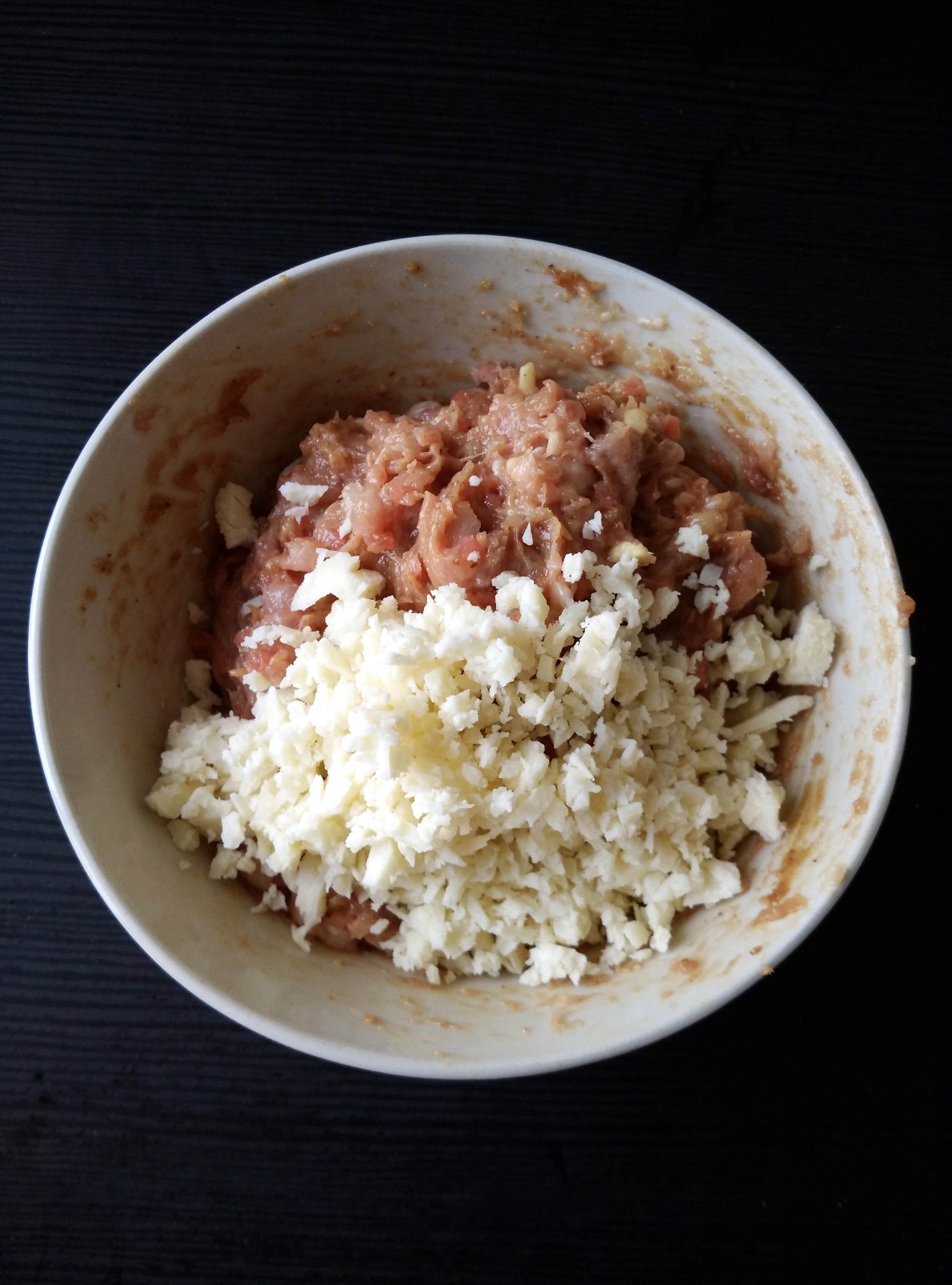5、肉餡里調(diào)入適量沙茶醬、蠔油、白糖、鹽,料酒;