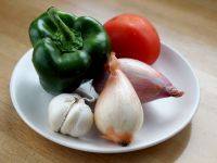 5.備好配菜:西紅柿、青椒、洋蔥和大蒜頭。