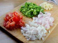 6.將西紅柿、青椒、洋蔥切丁,大蒜頭拍一下切碎備用。