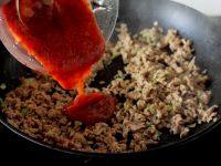 10.另起炒鍋,鍋熱倒油,油熱下肉泥,炒透后將西紅柿醬倒入,翻拌均。
