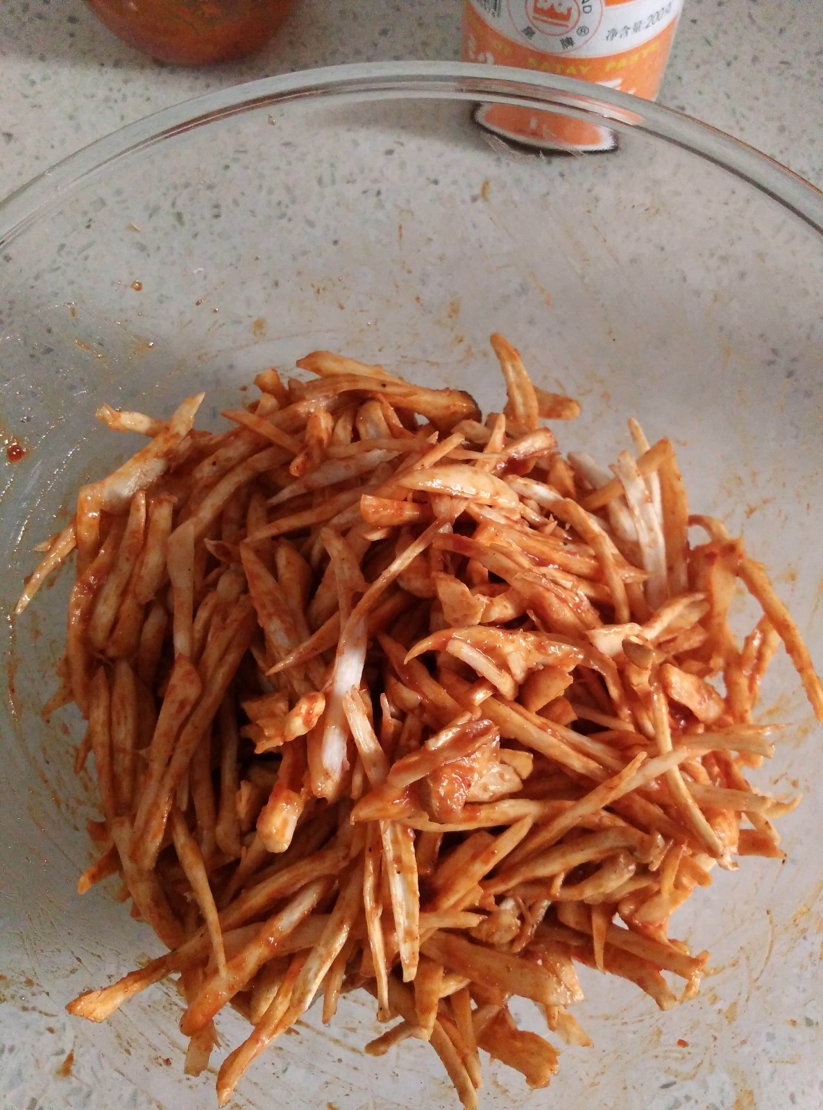 5. 用手或者筷子混合均勻,使得每條杏鮑菇絲都均勻裹滿醬料。
