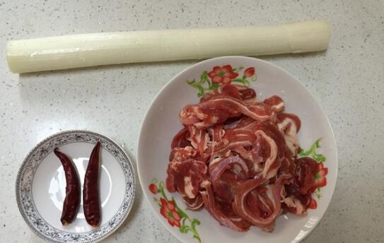 羊肉大卷切片,蔥白洗凈,干辣椒洗凈