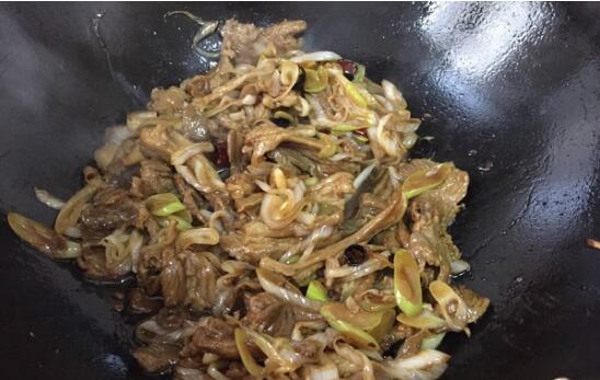 8.加入煸炒過(guò)的羊肉卷,少許老抽,翻炒均勻,出鍋前淋入一勺米醋翻拌下即可