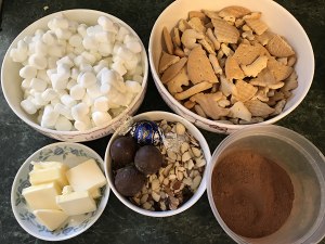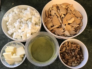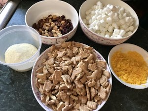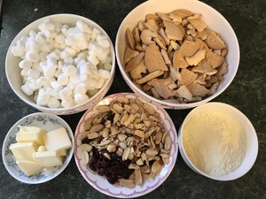 3. 餅干我選用的是瑪麗亞餅干,堅果用的是planters的混合堅果仁,無鹽或者少鹽的都可以,奶粉是德運全脂奶粉,黃油和棉花糖都是Walmart的自家制作品牌的,這兩樣估計在國內(nèi)也不好找。以上都是我選用的材料品牌,只做參考,沒有規(guī)定,大家平常覺得用什么好就繼續(xù)用什么就可以啦??!
