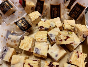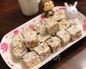 整好形后趁熱切成約3x3cm或者4x4cm大小的正方形方塊。然后撒上雪花粉即可。當然只是參考形狀,想要切成片狀或者長方形形狀也是可以的,這個沒有限制性。
