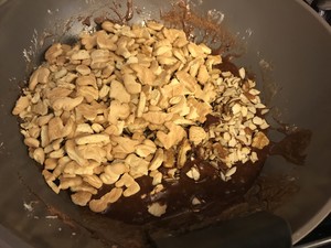 14. 然后再快速倒入餅干和果仁,混合均勻,再把剩下的可可粉和奶粉的混合物加入混合均勻……這個步驟一定要快,否則最后加入的奶粉混合物很難完全融入。
