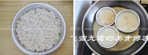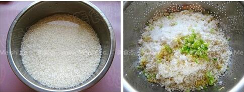 2.糯米瀝干后,加入姜末,鹽,玉米淀粉(可以有凝固的作用)蔥白(蔥根別放了,會容易炸糊?;蛘呤[不放也成)
