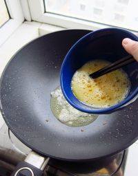 5.鍋內(nèi)蔥油燒熱,倒入蛋液