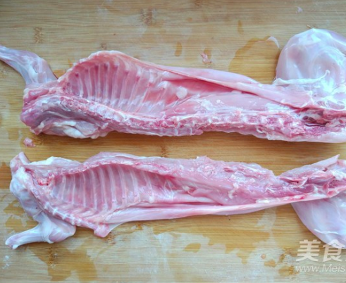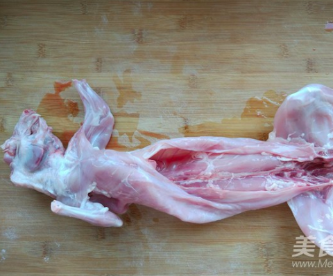 4.再用鋒利的刀沿著脊椎一側(cè),將兔肉分成兩半