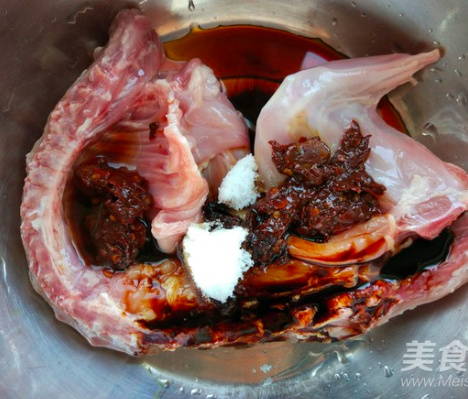 3. 關(guān)于兔肉的腌制:腌料中盡量不使用食鹽,而用其他含有咸味的調(diào)料代替。像郫縣豆瓣醬、蒜蓉辣醬、雞粉等都可以。這樣腌出來的兔肉鮮味更加柔和,鮮美,且更容易保持肉質(zhì)中的水分,不會發(fā)干發(fā)硬。
