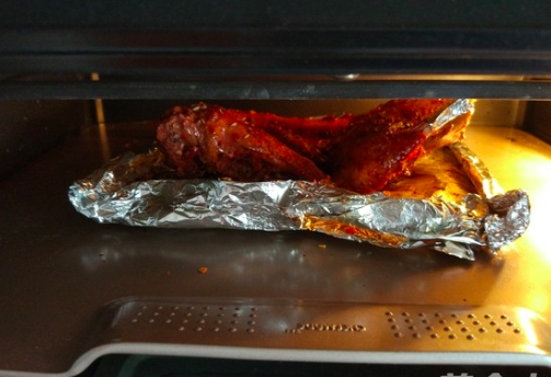 12.將腌好的兔肉(去除腌制時的調(diào)料)用鋁箔紙包好,放入預(yù)熱好的烤箱中層,上下火180度烤30分鐘左右
