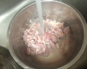 4. 兔子倒入鍋里開水里焯水一下,水開了一小會就撈出來,再洗一下兔子肉,洗掉白色渾濁的東西。