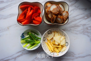 2. 紅辣椒切成滾刀塊;臘腸切成片;蔥切成段;老姜切成絲‘大蒜切成片’