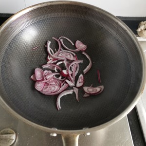 5. 接下來(lái)就是放一點(diǎn)油,將切好的洋蔥放到鍋里稍微翻炒下,稍微炒軟一點(diǎn)就可以,這時(shí)也會(huì)聞到洋蔥的香味。