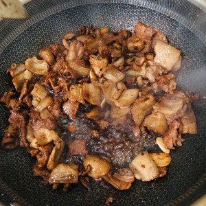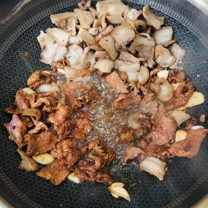 3. 鍋中先放點(diǎn)底油,下五花肉煸炒出油脂,有點(diǎn)焦的感覺,再放入瘦肉滑至斷生,下蒜片和豆豉炒香,淋少許料酒去腥