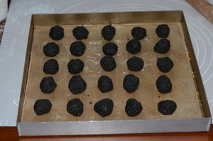 3. 成團(tuán)后的餡兒直接分割成10g/個(gè),擺入烤盤中,進(jìn)冷藏室冷藏。我試過放冷凍一樣可行,就是讓餡兒成型變硬嘛。