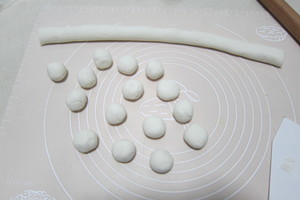 6. 揉好的面團(tuán)搓成長(zhǎng)條,分割成17g/個(gè),然后搓成圓球狀。