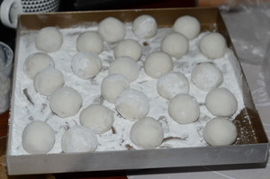 包好了的湯圓在手中搓圓,放入烤盤,烤盤上鋪一層干糯米粉防粘。(我烤盤里的糯米粉其實(shí)撒多了)