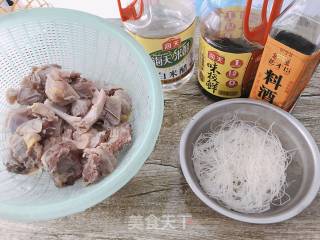1. 準(zhǔn)備所有食材,粉絲熱水泡軟,雞處理干凈切塊。