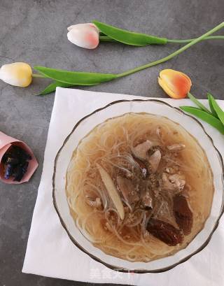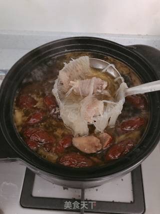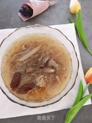5. 燉好的雞湯倒入砂鍋加粉絲紅棗味極鮮燜2分鐘即可。