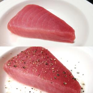 1、金槍魚(yú)常溫化凍4-5小時(shí),簡(jiǎn)單沖一下,用廚房紙輕輕吸去水分。兩面都撒黑胡椒,鹽和橄欖油腌漬15-20分鐘。