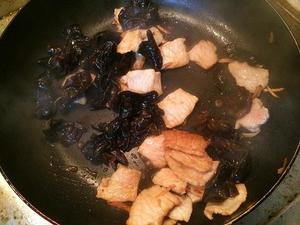 7. 加入切好的木耳,加入適量醬油,繼續(xù)翻炒。