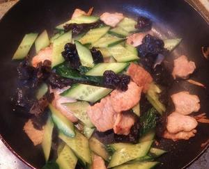 9. 這個(gè)菜不用放很多調(diào)味料,鮮嫩的黃瓜,營養(yǎng)的木耳,美味的雞蛋和瘦肉,體現(xiàn)出嫩、鮮、滑,即可。