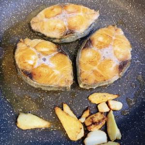 2. 魚(yú)塊先用廚房紙巾擦干表面水分。熱鍋冷油下姜片和蒜頭先爆香。轉(zhuǎn)系中小火下魚(yú)塊香煎。