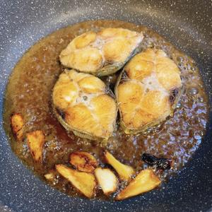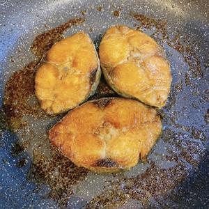 5. 中大火收干汁。期間要不停的往魚(yú)塊上澆汁,使兩面都上色。