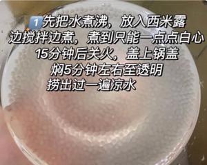 1. 先把水煮沸,放入西米露,邊攪拌邊煮,煮到只能一點點白心15分鐘后關(guān)火,蓋上鍋蓋燜5分鐘左右至透明撈出過一遍涼水