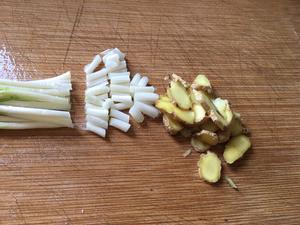 11. 等待料酒燒干的時(shí)候我們把姜切片,然后把小蔥的蔥白切一點(diǎn)下來(lái)。很多人都是這個(gè)直接把整捆蔥放