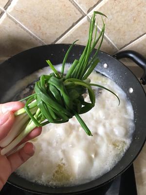 進(jìn)去煮,等湯好了蔥也黃了,這不符合我的顏值高的要求。但又不能不放,所以我們把蔥白切下來(lái)先放進(jìn)