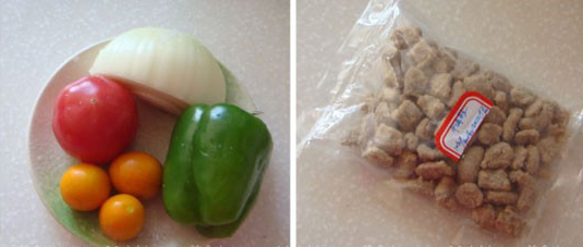 1.元蔥1/4個(gè)、中等青椒一個(gè)(實(shí)際用半個(gè)),小個(gè)西紅柿一個(gè),小金桔3個(gè)
