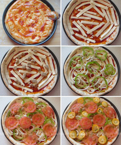 3、上面放的水果蔬菜等餡料隨意,家里有什么就放什么。牛肉粒也可以用香腸、蝦仁、培根等代替。